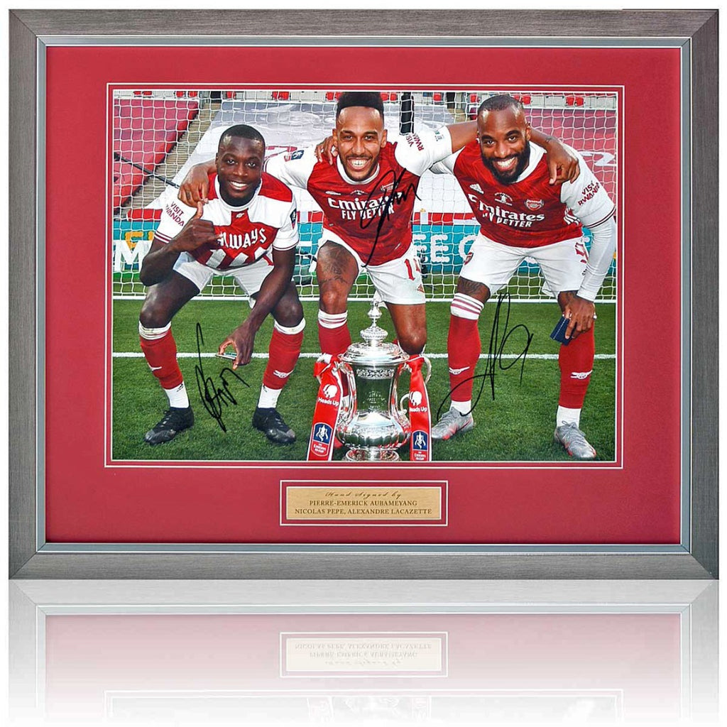 Fantastic 16x12" photograph hand signed by Pierre-Emerick Aubameyang, Nicolas Pépé & Alex Lacazette posing with the 2020 FA Cup trophy.