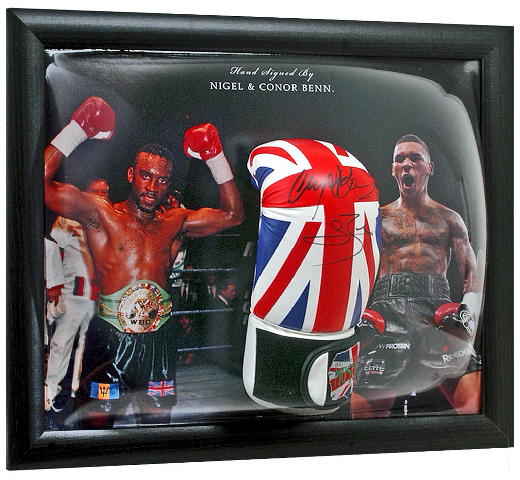 Fantastic domed boxing glove presentation hand signed by father and son duo, Nigel and Conor Benn.