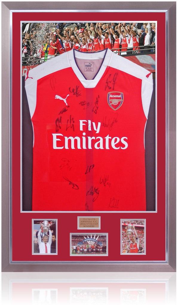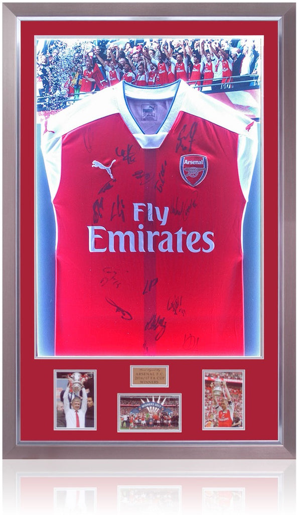 Official Arsenal Football Club home shirt hand signed by 18 members of the first-team squad who lifted the 2017 FA Cup trophy.