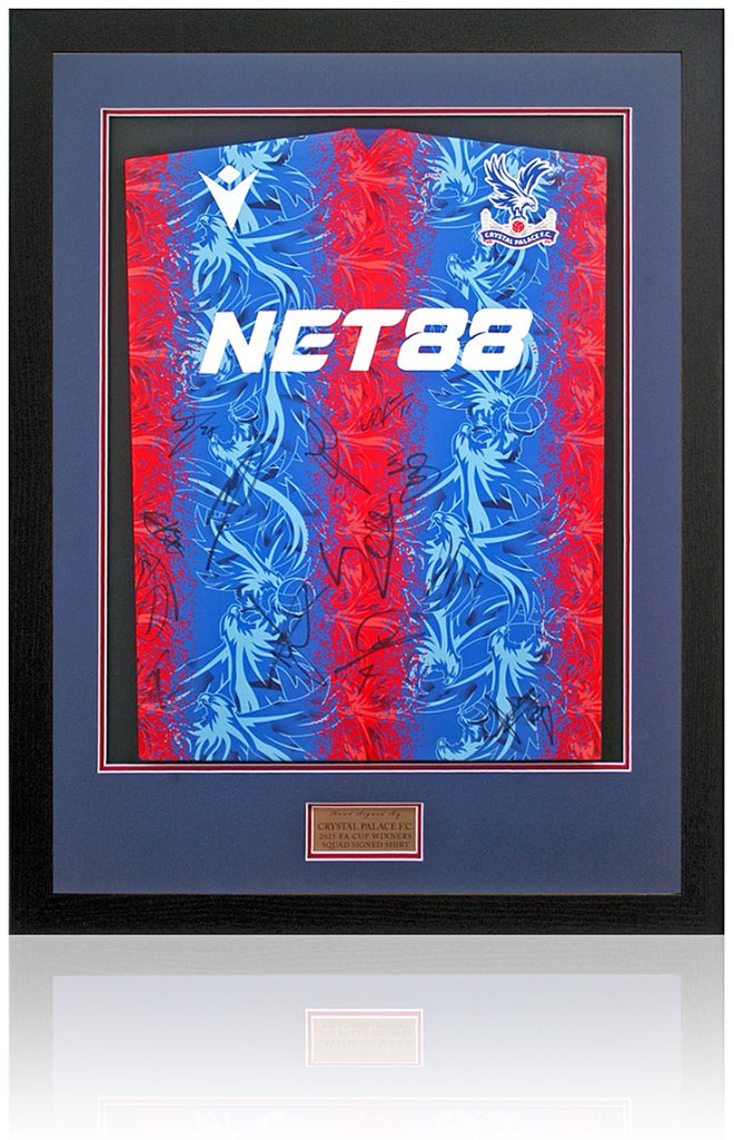 This fantastic piece of sporting memorabilia featuring a Crystal Palace home shirt, hand-signed by squad members of the 2025 FA Cup-winning squad.