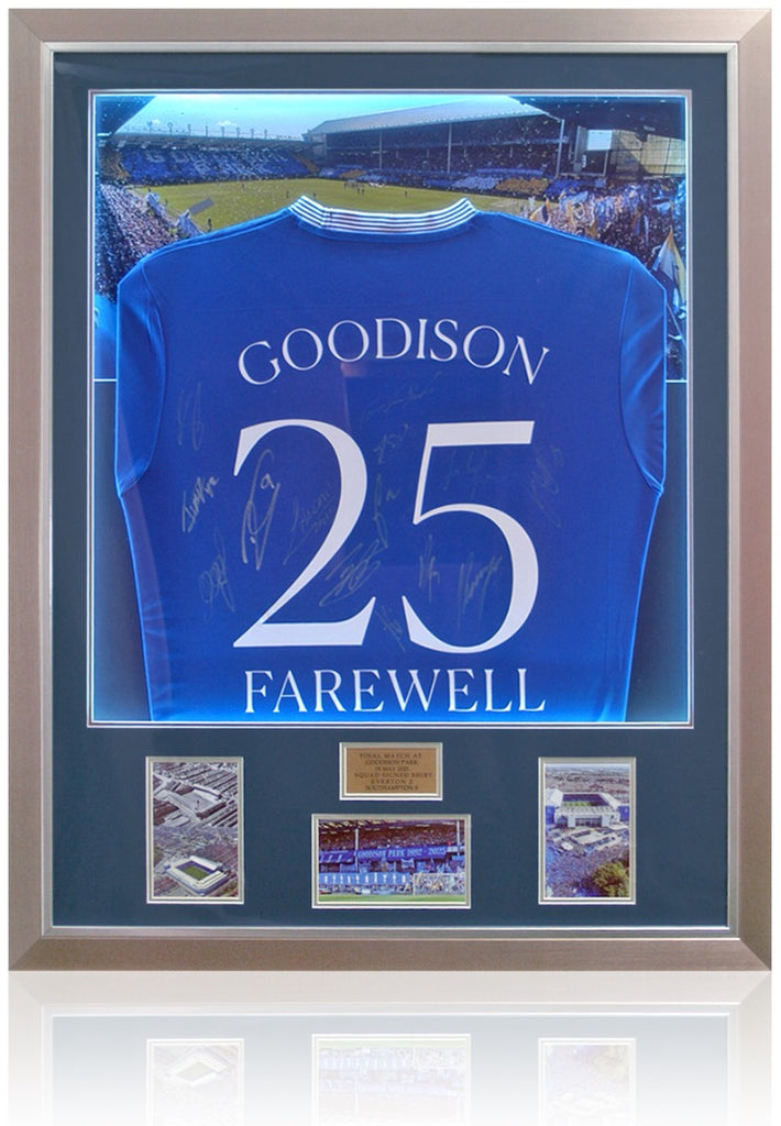 This fantastic piece of sporting memorabilia features an Everton home shirt, hand-signed by squad members who were part of the last ever match played at Goodison Park.