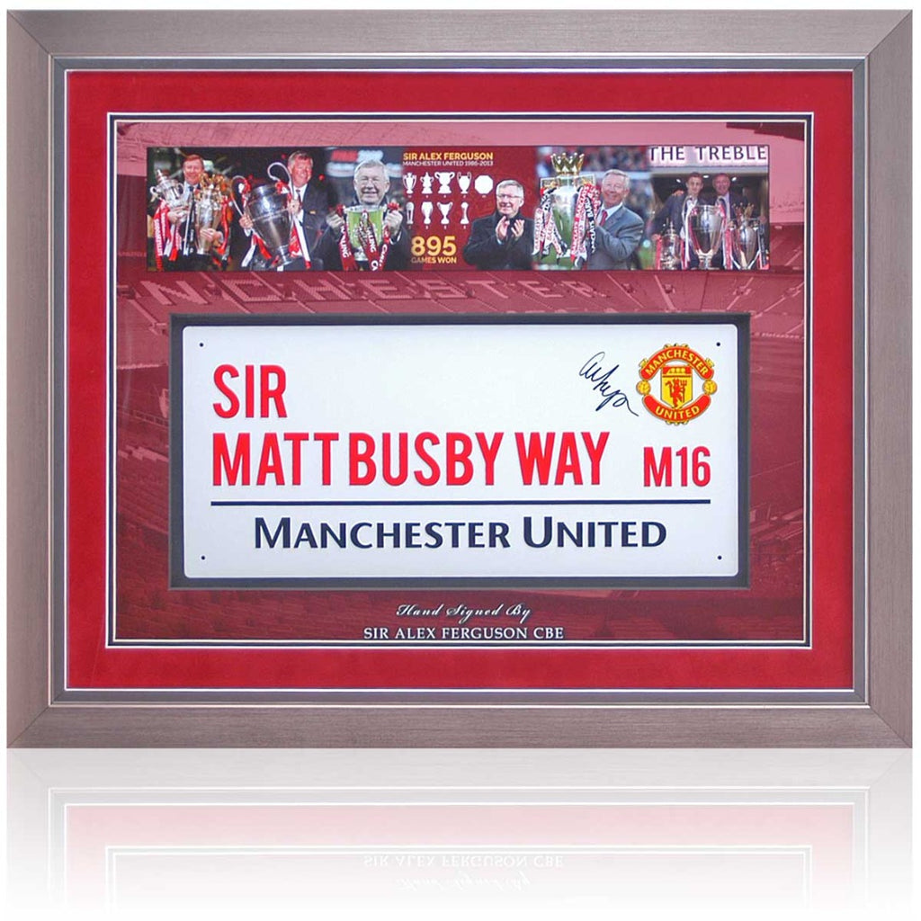 A fantastic presentation featuring a Sir Matt Busby Way metal street sign hand-signed by the greatest manager in the Premier League era, Sir Alex Ferguson. This incredible piece is displayed in a photomontage of the legendary United manager and comes double recess mounted in crushed red velvet and black gallery artboard.