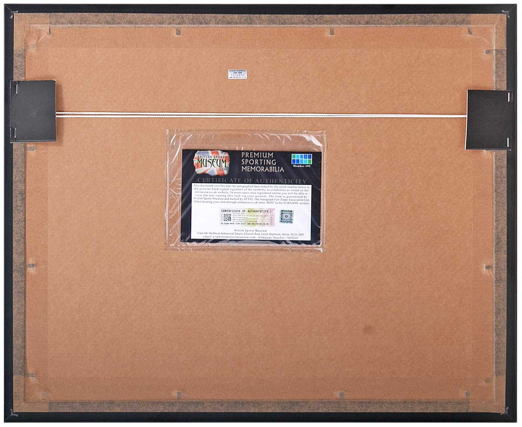 This amazing piece comes double recess mounted in black and silver mount board in a gold detailed gallery which measures 23x19 inches. The item comes with a certificate of authenticity issued by AFTAL members The BritishSportsMuseum.com.