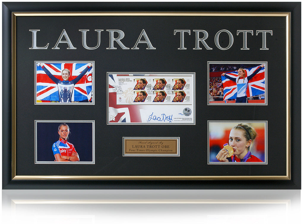 Stunning presentation of 5-time Olympic gold medal-winning legend, Laura Trott. This beautiful display features a 2012 First Day Cover stamp collection hand-signed by Dame Laura Kenny surrounded by images of her competing for England.