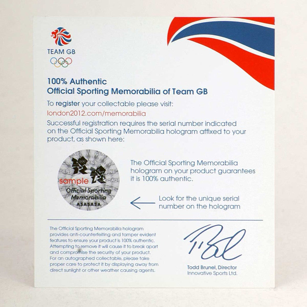 This fantastic piece of sporting memorabilia comes triple recess mounted in white, red, and blue artboard and framed in a 24×20inch pewter gallery frame. The item comes individually hologramed and numbered by the London 2012 commitee and is ready for you to register in your name on the London 2012 website.