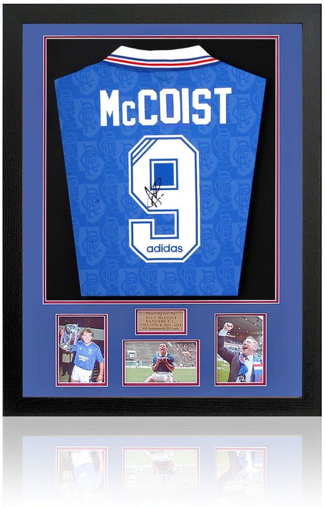 This fantastic piece of sporting memorabilia features a retro style Rangers shirt, hand-signed by the legendary Ally McCoist.
